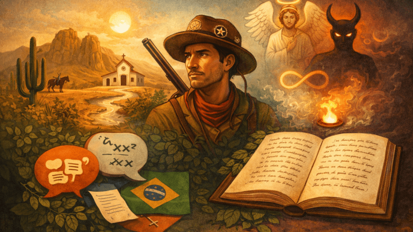 Grande Sertão: Veredas, obra-prima de João Guimarães Rosa publicada em 1956, é um dos romances mais importantes da literatura brasileira e figura com frequência nas provas de vestibular de 2026, especialmente na Fuvest, Unicamp e Enem. Narrado pelo jagunço Riobaldo, que reflete sobre sua vida no sertão mineiro, o livro vai muito além do regionalismo para se tornar uma profunda reflexão filosófica sobre o bem e o mal, o amor, o destino e a condição humana.